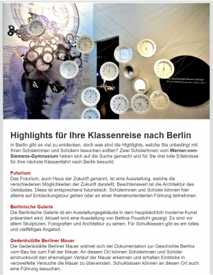 Bis zum Jahresende werden noch drei weitere Newsletter veröffentlich. Wer nun Interesse hat in der AG „Vermarkte deine Stadt“ mitzuarbeiten und auch eigene Artikel zu verfassen, kann sich gerne im Büro der Berufsorientierung melden oder an dudzus@siemens-gymnasium-berlin.de ein Mail senden.