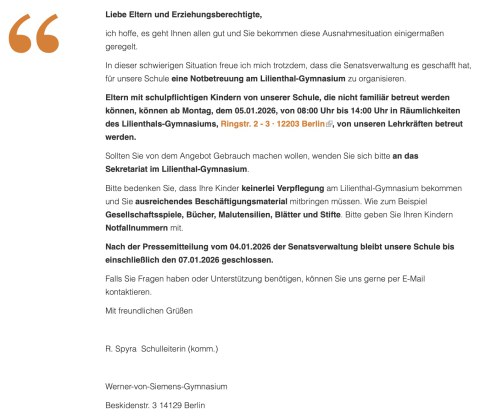 • 04. Januar 2026: Werner-von-Siemens-Gymnasium geschlossen. Notbetreuung am Lilienthal-Gymnasium. (1,006)